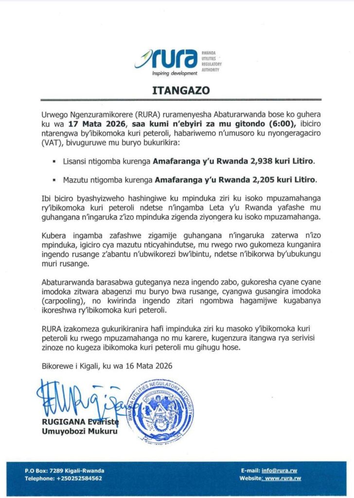 Ku wa Kane tariki ya 16 Mata ni bwo Urwego Ngenzuramikorere (RURA) rwatangaje ibiciro bishya by’ibikomoka kuri peteroli, aho litiro ya lisansi yageze kuri 2,938 Frw.