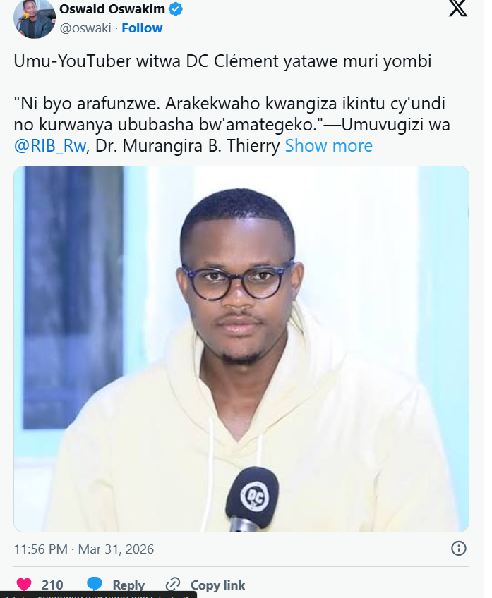 Urwego rw’Ubugenzacyaha (RIB), rwatangaje ko Niyigaba Clement uzwi nka DC Clement kuri YouTube, yafunzwe acyekwaho kwangiza ikintu cy’undi no kurwanya ububasha bw’amategeko.